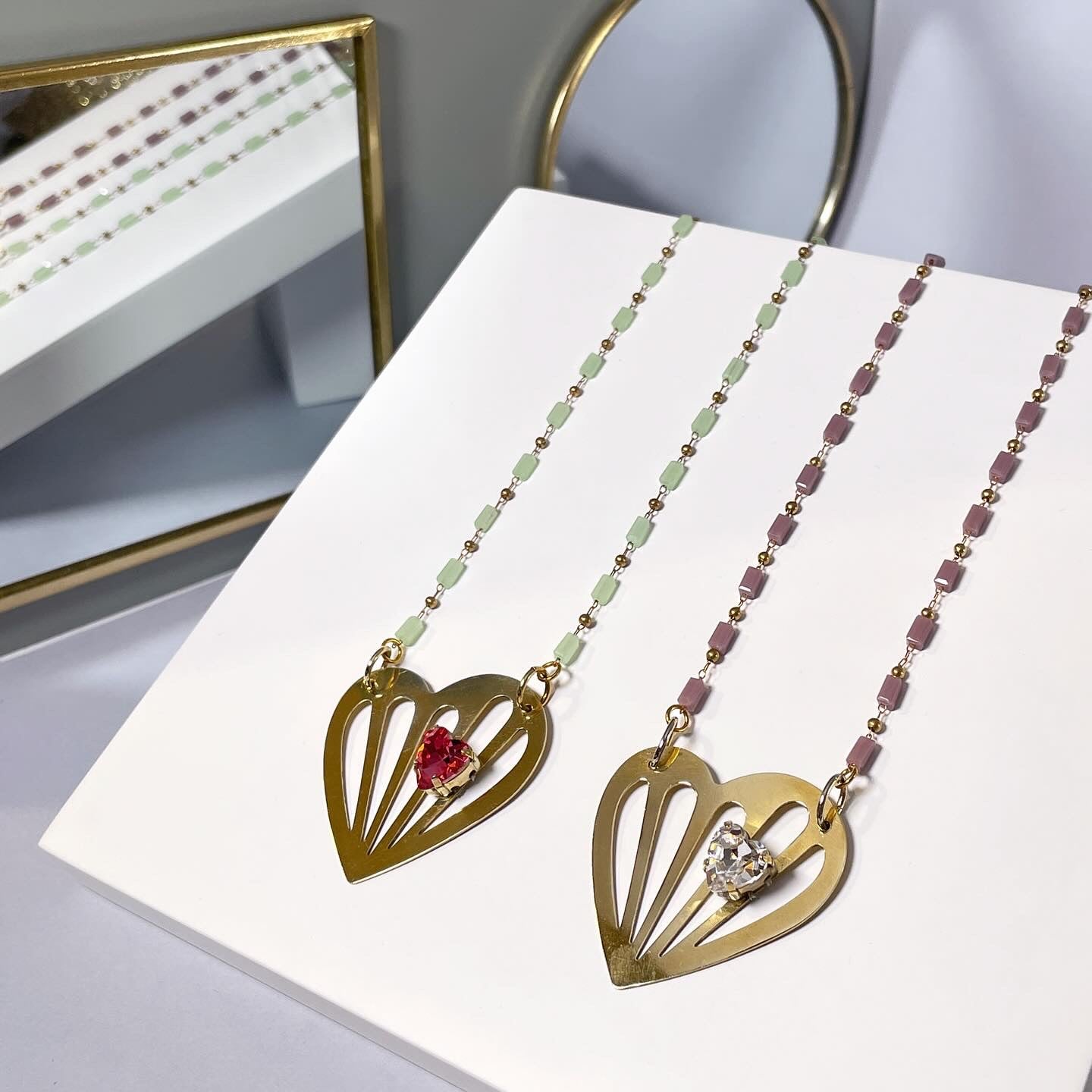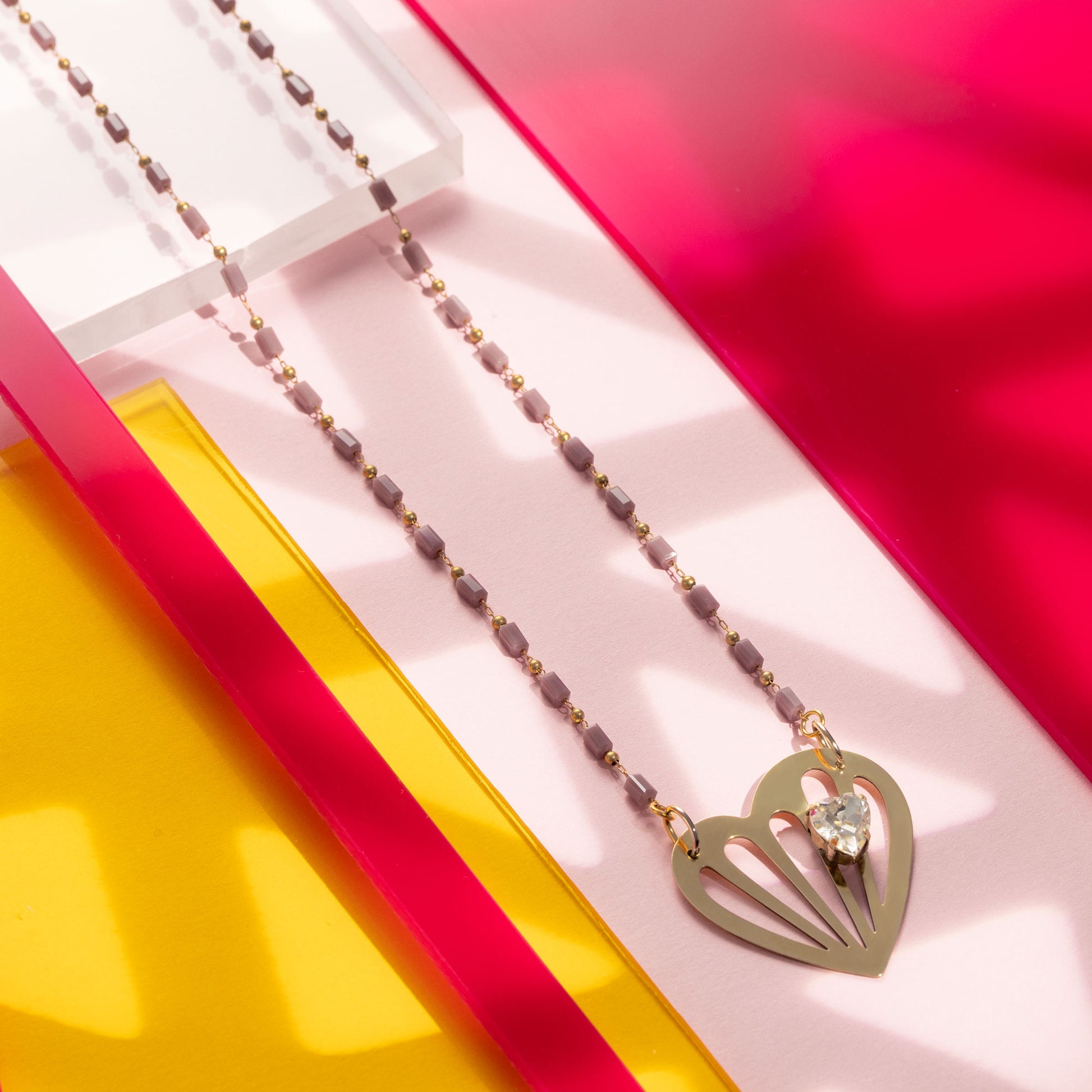 long necklace with galvanized brass elements, heart faceted crystal and chain with lilac glass elements