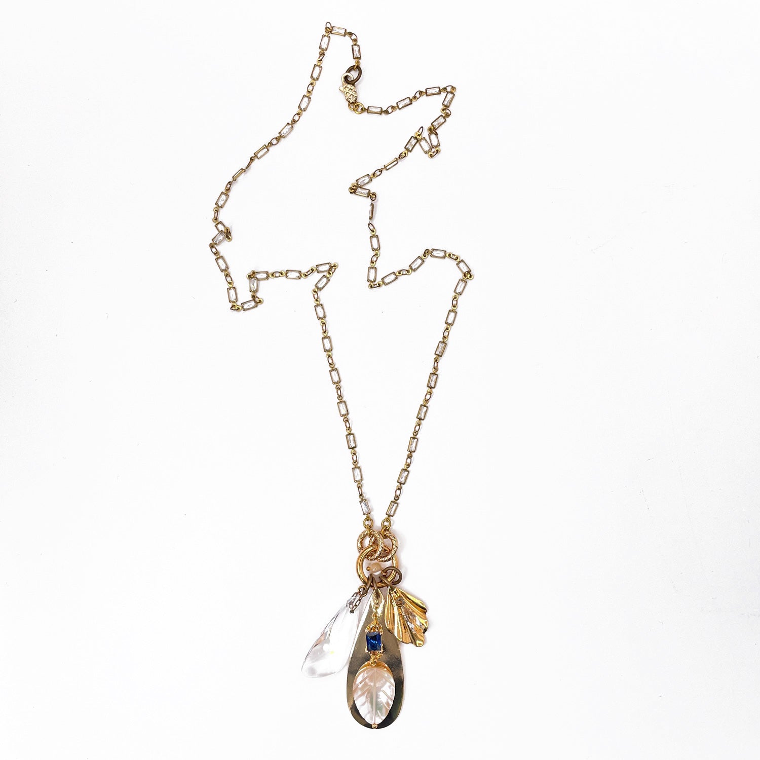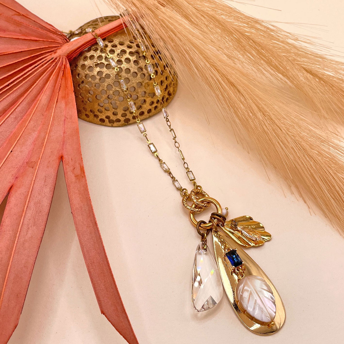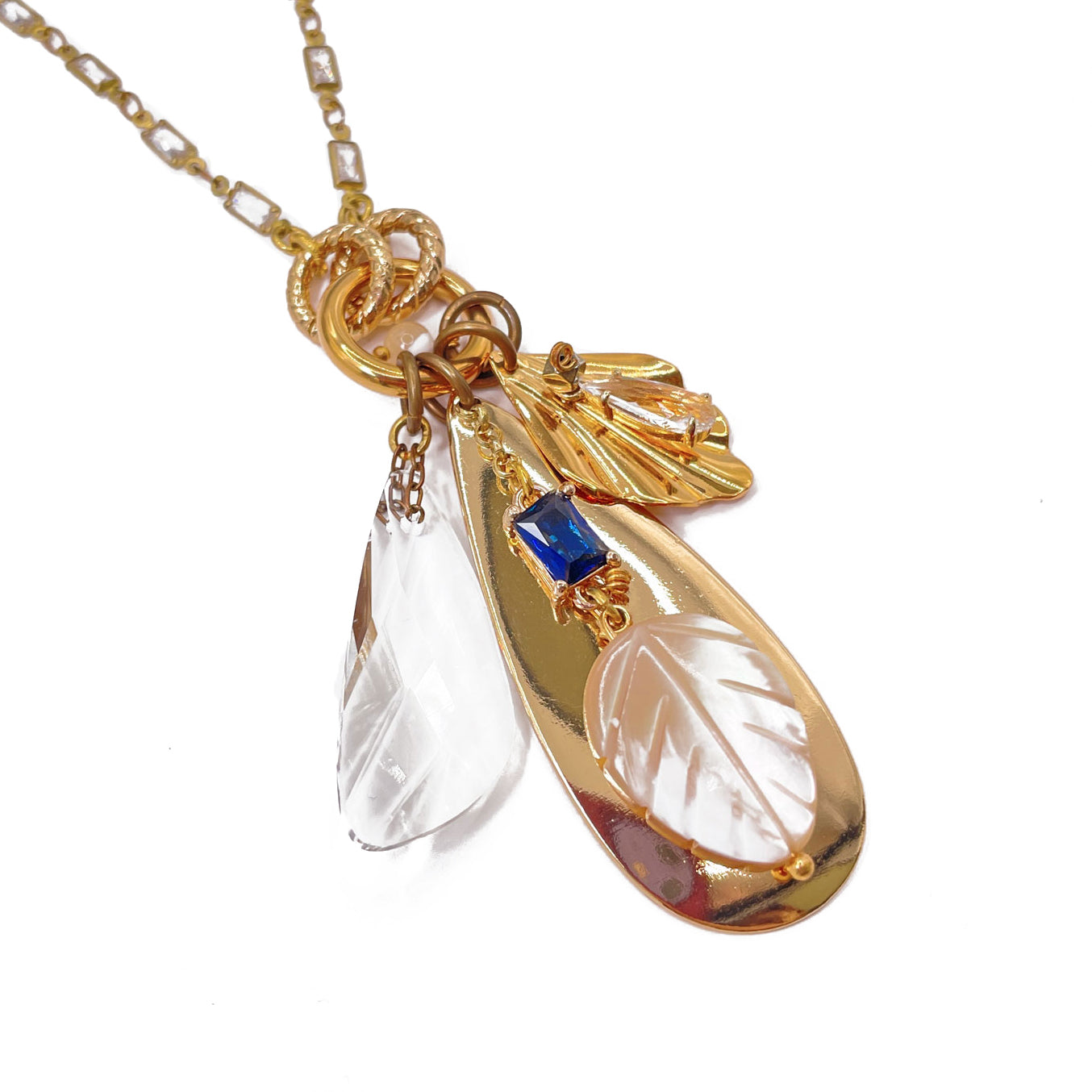 collana lunga con elementi in ottone, foglia pendente in madreperla, cristalli sfaccettati, perline in ematite e catena di zirconi