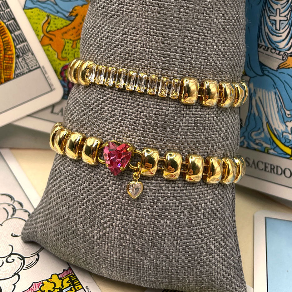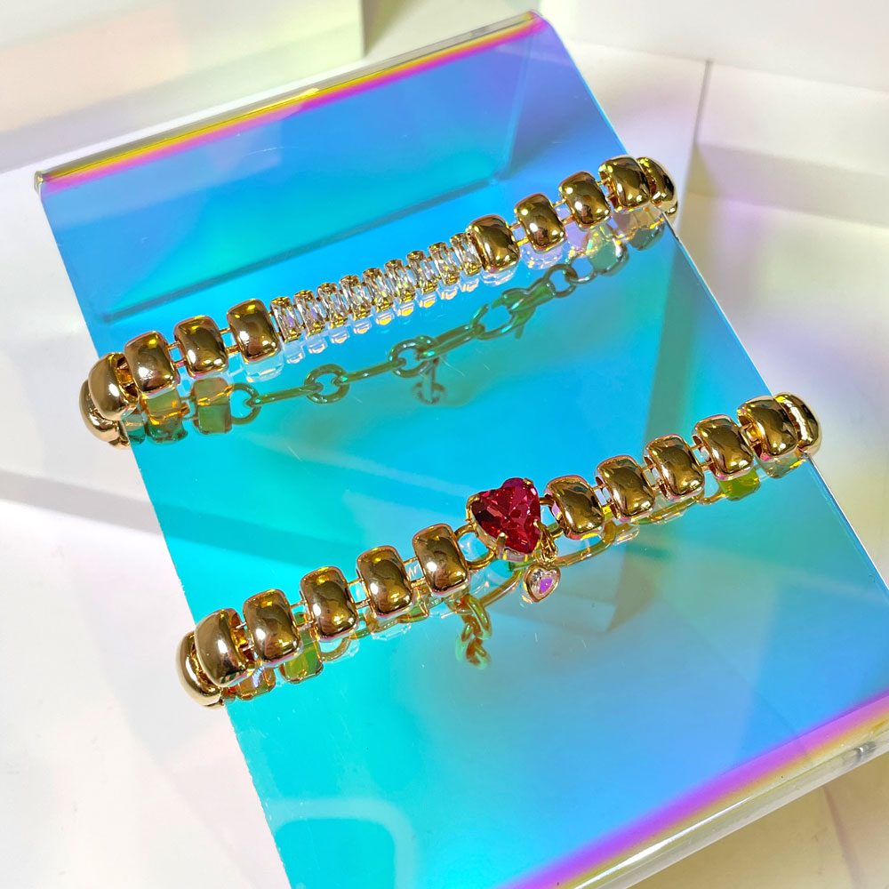 bracciali in ottone galvanizzato oro, con catena vintage e cristallo centrale a forma di cuore sfaccettato o catena di zirconi
