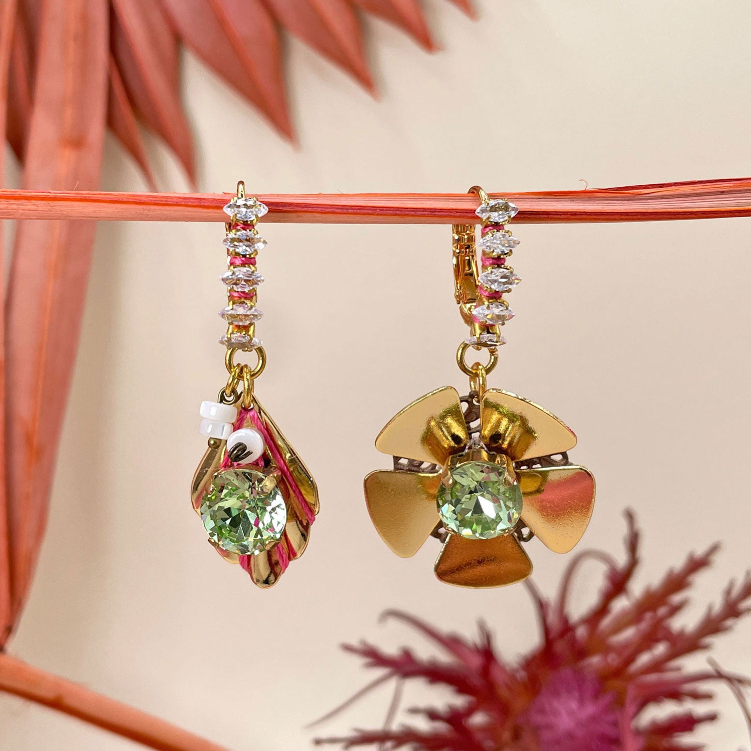 orecchini asimmetrici con elementi in ottone, cristalli sfaccettati, catena in zirconi e perline piatte in madreperla e filo di seta