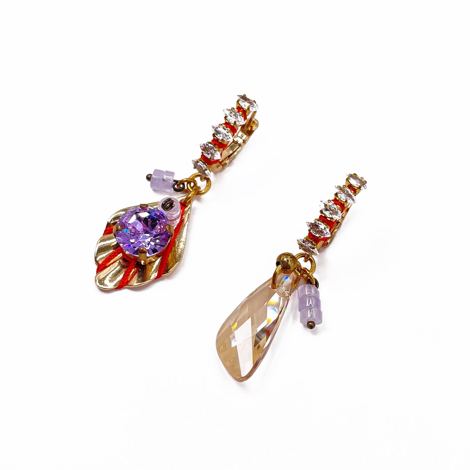 orecchini asimmetrici con elementi in ottone, cristalli sfaccettati, catena in zirconi, perline piatte in ametista e filo di seta