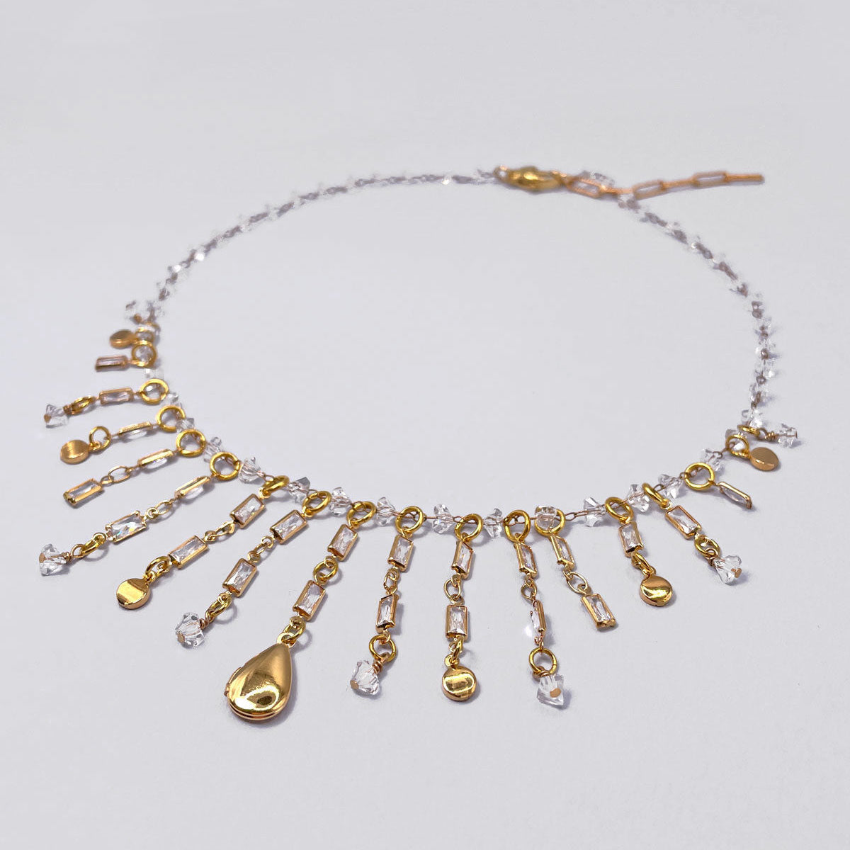 collana con elementi in ottone galvanizzato, baguette di zirconi e mini locket a goccia vintage